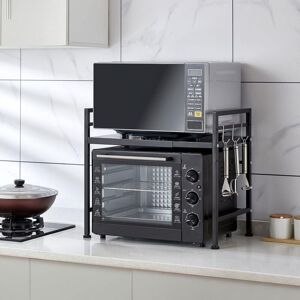 【2-Tier Storage Rack】- Adjustable length from 43 to 60 cm, height: 48 cm, width: 32 cm. The retractable microwave oven rack provides extra storage space by simply adjusting the bracket and it can easily adapt to the size of almost any size microwave oven. 【Large Weight Capacity】 Load capacity: 25 kg (You can choose to place your microwave on or under the rack.) The sturdy metal frame has a good weight capacity. 【Spacious Storage Capacity】 Ideal for saving space at home and neatly organizing your kitchen, bathroom, living room, office, garden and cabinet countertop, etc. 【Practical Hooks】 We provide you with 3 S-hooks for hanging spoons or kitchen towels. 【Sturdy Metal Frame】 Made of PP and stainless steel, BPA-free, environmentally friendly, sturdy and durable