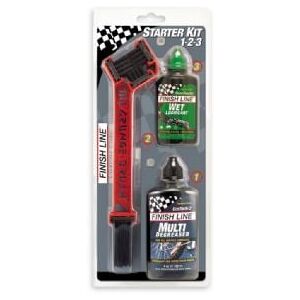 Starter Kit 1-2-3 includes Grunge brush degreaser and lubeHard-wearing brush designed for super-fast cleaning of chains and other bike componentsDouble ended design with specific chain cleaner at one end and longer bristle brush at the otherLonger brush can be used to clean derailleur's jockey wheels chainsets between cassette sprockets etcClean prior to lubing for assured smooth operation of your drivetrainDip brush into degreaser before use for maximum cleaning potentialIncludes 4 oz bottle of EcoTech 2 cleaner and degreaserAlso includes a 2 oz bottle of Cross country wet lubeSuper-durable synthetic ingredients create a high viscosity lube that protects and lubricates parts for longerProven performance for long rides muddy off-road conditions and long rainy commutesThe synthetic oils used are non-toxic and biodegradable