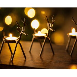 6 x Reindeer Tea Light Holders These charming reindeer are the perfect way to bring some fun to this years' festive decorating! In a set of 6, these reindeer come pre-filled with tea lights, so you can display these straight from the box! Simply light and watch the warm glow illuminate the room! Made from hard wearing metal and hand painted in a rustic antique brown, these reindeer are eye catching from every angle. Place along a window sill, on shelving, a mantlepiece, or even as a unique table centrepiece for your festive dining! Making an ideal gift or a quick and easy way to bring some festive cheer to your home, you can't go wrong with these adorable reindeer! - Dimensions: 5.5 x 2 x 5.5" (approx) - Dimensions of Candle Holder Area: 2 x 2" (approx) - 6 Tea lights included � Hard wearing Metal