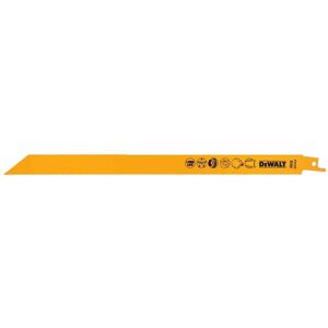 DeWalt Bi-Metal Reciprocating Blades for extreme applications, as well as demolition work. They have a bi-metal construction, combining a HCS body and cobalt-alloyed HSS cutting teeth for increased flexibility and durability. Aggressive tooth geometry with a special angle for a fast and effective removal of material, especially for tensile and abrasive metals. Universal shank fits all major brands including DeWalt, Bosch, Hitachi, Flex, Makita, Metabo, Skil. Ideal for fast cuts in wood with nails and tough plastics. With a Plunge Point tip that pierces the wood and removes more material, for fast and accurate cutting in wood applications. Features & Benefits • Bi-Metal construction, as a combination of HCS bodies and cobalt-alloyed HSS-cutting • Aggressive tooth geometry with a special new angle for a fast and effective removal of material, especially for tensile and abrasive metals • Ideal for extreme applications as well as demolition work • Specially formulated anti-stick coating minimizes friction and gum-up for smoother cuts Specifications • Length: 228mm • Pitch: 3.6-5.1mm • Pack Quantity: 5