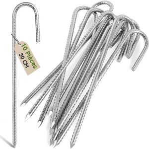 Dimensions - Pile length 30cm; Rust-resistant galvanized steel - The 10pcs tent ground anchor pegs are made of sturdy steel bars, reliable and durable for outdoor use. The J-shaped hook design helps to increase the strength of the installation. The premium quality makes the hook shiny, not easy to rust or corrode, durable and can be reused for many times. How to use - The pointed end of the chisel allows the steel stake to easily penetrate the ground without any effort. You can tap them or use a mallet to hammer them further. The tip of the chisel can easily drive steel stakes into the ground without the need for auxiliary tools. You can press it to drive the rebar stake further into the ground. No Tools Required - The sharp chisel tip is suitable for use on hard ground, grass, sand, hard clay and rocky soil. The metal stakes can be driven very deep without any effort. MULTIPLE USES - They help secure swing sets, trampolines, camping tents, hammocks, slides, fences, patio decorations,