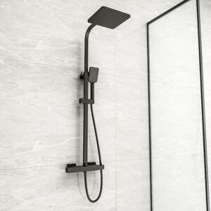 Description This thermostatic shower faucet with stem valve allows you to stop or control the flow of shower water, while the thermostatic control provides complete temperature performance, perfect for any modern bathroom. The left handle of the bar shower controls the water on/off and switching modes between the two outlets; the shower head and shower handle and the right handle control the temperature from 20-50 degrees Celsius and has a safety stop preset to 38 Celsius set temperature to ensure comfort and safety. The height of the lifting rod can be adjusted, and the product also comes with an adjustable stand for the hand shower that you can slide up and down on the rails as needed. Comes with slim shower head, handset, 1.5m hose and stand. Square Exposed Twin Head Shower - Matte Black 8" (200mm) stainless steel square slimline shower head with adjustable swivel so it can be tilted to adjust the spray and provide ease of use Modern matte black finish Anti-rust and