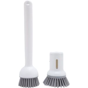 INNOVATIVE DESIGN WITH DISPENSER: This dish scrub brush features an innovative design that allows for liquid dispensing and a rotating brush head, making cleaning efficient and enjoyable LONG AND SHORT HANDLE COMBO: The set includes both long and short handle brushes, making household cleaning tasks more effortless and versatile for all your scrubbing needs IDEAL FOR ALL CLEANING TASKS: Whether you're washing dishes or scrubbing pots, this brush is for a variety of household cleaning tasks, ensuring no spot is left dirty EFFECTIVE STAIN REMOVAL: Designed for high efficiency stain removal, this brush is gentle on your hands and skin, offering a comfortable cleaning experience without hurting your hands ROBUST AND PRACTICAL: Constructed from PP, PET, and silicone, this scrub brush is built to last, making it a convenient and practical addition to your kitchen cleaning supplies Item Type: Dish Brush Material: PP, PET, silicone 1 x Long Pot Brush1 x Short Pot Brush
