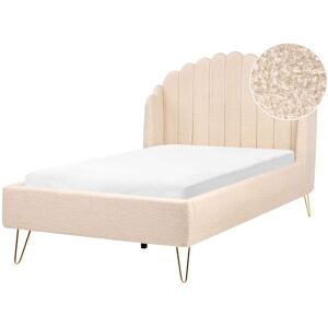 Bed Frame with Shell Headboard. Meet the bed you dreamed of. This boucle-upholstered beauty in a retro-inspired look will be the statement piece of any bedroom. Complete with sturdy hairpin legs and a channel-tufted shell headboard, it will introduce a glam feel to the interior. The bedhead is winged, creating a cosy space for watching your favourite shows or nighttime reading. The set also includes a slatted base that ensures stable support for a mattress. Details: Product Type: Double Bed Style: Glam General Color: Beige, Gold Material Type: Fabric Main Material: Boucle Additional Material: Steel Material Composition: 100% Polyester Fabric Upholstered Back: No Dimensions: Headrest Dimensions: 121x106 Width: 137 cm Length: 214 cm Height: 126 cm Sleeping Surface: 120x200 cm Weight: 48 kg Weight Capacity: 250 kg Offer Includes: 1 x Bed Frame, 1 x Slatted Frame (30 Sprung Slats), Not Included: Mattress, Bedding and Cushions Key Features: Comfortable and Wide Sleeping Surface, Retro