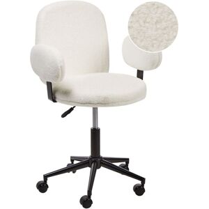 Plush Desk Chair with Armrests. Create a cosy space in your office by adding this comfortable armchair. Its thick seat and backrest, with the addition of armrests, are all upholstered with soft-to-the-touch boucle fabric in a beautiful off-white shade. The classic black base is made of durable metal that ensures stability and thanks to the gas lift you can adjust the chair's height to your needs. It also includes a 360° swivel function, which makes it a great addition to your room. Details: Product Type: Office Chair Style: Retro General Color: White, Black Shade: Off-White Material Type: Fabric Main Material: Boucle Additional Material: Iron Legs material: Metal Seat Material: Fabric Material Composition: 100% Polyester 360 Swivel: Yes Adjustable Parts: Seat Height Armrests: Yes Finish: Powder Coated Leg Caps/ Pads: No Tilting: No Dimensions: Armrests Height: 66 cm Depth: 58 cm Seat Height: 42-57 cm Width: 58 cm Height: 80-95 cm Seating Surface: 46x46 cm Weight: 8 kg Weight Capacity: