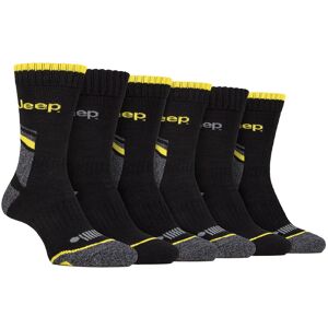 Jeep Mens 6 Pack Workwear Boot Socks: Introducing our Jeep Workwear Boot Socks - the ultimate blend of comfort and durability. This 6 Pair Pack is designed to enhance your everyday wear with the utmost protection and support. Crafted from a soft and breathable heavyweight performance poly blend, featuring 60% Polyester, 38% Cotton, 1% Elastodiene, and 1% Elastane, these socks ensure your feet stay dry and cool throughout the day. Thanks to the full terry cushioning and breathable panels, even long hours of standing and walking become a breeze. Your feet will be shielded against daily shocks, casual impacts, and general wear and tear, thanks to the dense cuff-to-toe cushioning. The deep rib cuffs, ankle support, and arch supports ensure a secure and comfortable fit that stays in place without constant adjustments. These boot socks come in a medium thickness, making them suitable for various occasions and activities. Whether you're wearing work boots or safety shoes, these socks will make your experience much more comfortable. The ruggedly stylish design features the iconic Jeep branding, adding a touch of sportiness to your workwear ensemble. Available in two striking color combinations - Navy/Grey/Yellow and Black/Charcoal/Yellow. Machine washable at 40°, these socks are easy to care for, ensuring they remain reliable companions for your daily adventures. Extra Product Details: Soft and breathable heavyweight performance poly blend with cotton Full terry cushioning for extra comfort during long days of standing and walking Arch and calf supports for added stability and protection Dense cuff-to-toe cushioning for protection against shocks and wear Breathable panels to keep feet dry and cool Ruggedly stylish design with iconic Jeep branding Suitable for work boots and safety shoes Available in two striking colour combinations - Navy/Grey/Yellow and Black/Charcoal/Yellow.