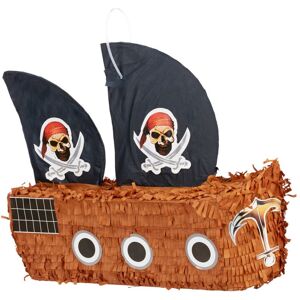 With this pirate ship pinata, you can create a great atmosphere at the next children's birthday party in no time at all. Fill it with the included golden coins and other great surprises such as sweets, toys and small gifts. The children then take it in turns to hit the pinata with the stick while blindfolded until it bursts open and the surprises fall out. The higher the pinata is hung, the greater the degree of difficulty. This party game, which is particularly popular in Mexico, is also ideal for school enrolments, baby showers or hen parties. As a fun party decoration, the pirate ship is a guaranteed eye-catcher. Pirate ship pinata in detail - Dimensions H x W x D: approx. 35 x 44 x 15 cm - Weight: approx. 0.1 kg - Material: Paper - Colour: Brown, black Pinata accessories in detail - Dimensions bat L x Ø: approx. 50 x 2.5 cm - Blindfold dimensions H x W: approx. 8 x 16 cm - Weight stick: approx. 80 g - Weight of mask: approx. 4 g - Material: Paper - Colour: Colourful Pirate gold