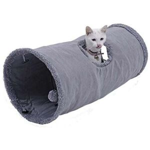 LARGE DIAMETER - SIZE S - Diameter: 25cm, Length: 50cm. Please pay attention to the size before ordering! SAFER UPGRADE VERSION - We reinforced the steel ring cover, which makes it harder for the wire to come out. Make the tunnel safer for cats. HIGH QUALITY MATERIAL - It is made of artificial suede and wool with good texture, more durable and safer, different from other plastic tunnels. INTERACTIVE CAT TOY - The tunnel has 2 holes and 1 hanging toy ball. Besides, you can combine it with other tunnels to bring more fun to your lovely cats. You can also play with your cats and spend a nice time together. EASY TO STORE AND CARRY - It is foldable and takes up little space after folding. Very easy to store and carry. Good choice if you spend time with cats.