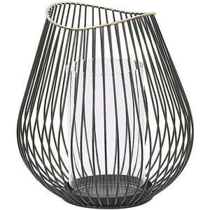 Minimalist Candle Holder with a Glass Insert. This black lantern is a great space-filler for every modern living room or bedroom. Put a pillar candle or a tea light into a glass candle holder inside and enjoy the warm light beautifully distributed thanks to the openwork structure of the lantern. Featuring a golden rim, its design works particularly well in glamour or minimalist interiors. Details: Product Type: Lantern Style: Modern General Color: Black, Gold Material Type: Metal Main Material: Metal Additional Material: Glass Shape: Oval Handmade: No Dimensions: Depth: 20 cm Width: 20 cm Height: 22 cm Weight: 1 kg Offer Includes: 1 x Candle Holder Key Features: Chic Look, Decorative Yet Functional, Perfectly Complements Home in Any Decor, High-Quality Materials, Precise Finish Assembly Information: Does Not Require Assembly Maintenance tips: Metal: 1.Clean with a mild cleaner and soft cloth, wipe dry afterwards 2.To avoid scratches do not use abrasive cleaners 3.For copper or chromed