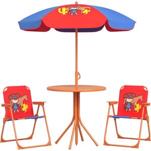 Elevate playtime with our fantastic Outsunny cowboy-themed kids garden table and chairs set. An enchanting picnic table with two foldable chairs, igniting youthful imagination and creating delightful al fresco moments. An adjustable parasol shields them from sun or drizzle - great for tea parties. Easy portability allows you to take it anywhere, whether it's the garden, park or beach. Drawing, snacking, playing and more, this space for kids promises endless possibilities. Specifications: ● Colour: Red, blue and orange ● Material: Steel pipe and polyester ● Dimensions: Table: 50H x Φ49.5cm. Chair: Fully expanded: 50H x 36.5W x 38.5Dcm. Folded: 6H x 49L x 39Wcm. Six-bone umbrella: 86-122H x Ф100cm. Seat: 26H x 29W x 23Dcm. Armrest: 38H x 20Lx 3.5Wcm. Backrest: 28.5H x 29Wcm ● Weight capacity: Chair: 35kg. Table: 20kg ● Qualification age: 2+ years. Suitable for ages 3-6 years ● Item label: 3E3-003V00MX Features: ● A four-piece set including two foldable chairs, a table and an adjustable