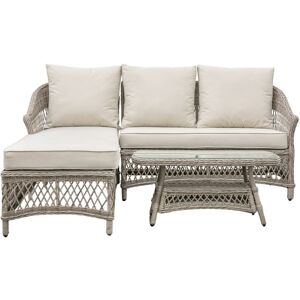 Make the right choice for the upcoming Summer season choose this three-piece dining set from Rosalind Wheeler for endless hours of comfort and joy. In a contrasting cream tone, thick cushions are placed on the seats for comfort, with a stylish striped bolster cushion also included for extra style all with removable covers which can be washed clean to keep them fresh and hygienic. The set is completed with a matching two-tier table, with a tempered glass top for a chic finishing touch. Three-piece set formed of three armchairs and a coffee table. Metal frame, wrapped in PE wicker for a sturdy structure that is resistant to mild weather damage. The smooth surface is easy to clean. Thick padded seat for comfort, with removable and washable covers to keep them clean. Stylish striped bolster cushion for extra comfort and support. The two-tier table, provides plenty of room, with a sleek glass tabletop. Maximum load: chair: 160kg, table: 30kg. Assembly required. Rosalind Wheeler