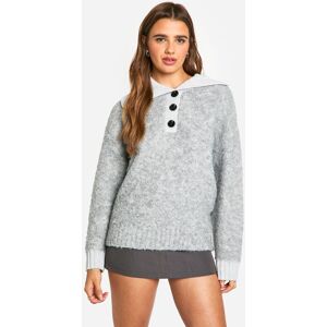 Oversized fit for ultimate comfort and style Ribbed collar adds a touch of texture Three-button placket for adjustable neckline Long sleeves with ribbed cuffs for a snug fit Versatile design suitable for various casual occasions Embrace laid-back chic with this oversized pullover, perfect for the fashion-forward woman who values both style and comfort. The ribbed collar and button placket add a sophisticated touch to this casual piece, allowing you to customise your look effortlessly. Pair it with a pleated mini skirt for a trendy campus-inspired outfit, or throw it over your favourite jeans for a relaxed weekend ensemble. For a cosy autumn look, team it with knee-high boots and a spacious tote bag. This jumper is ideal for casual outings, coffee dates with friends, or lazy Sundays at home. Its versatility makes it a wardrobe staple that can be dressed up or down to suit your mood and the occasion, embodying the Boohoo spirit of accessible, on-trend fashion for the young, social butterfly.