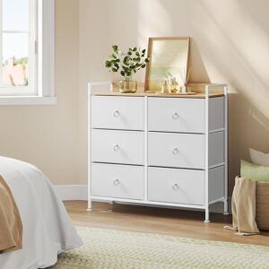 SAY BYE TO CLUTTER: The storage chest of 6 drawers, with each measuring 37x28x20cm, helps you easily sort and organise T-shirts and socks. Plus, the top of the storage cabinet can hold 20kg to display vases, potted plants, etc. PREMIUM MATERIALS: The storage cabinet is constructed from metal frame, metal cross braces, E1 grade engineered wood shelf and fabric drawers, which are made of high-quality double-layer non-woven fabric, hard cardboard and MDF. The unit can hold up to 50kg in total and stand stably on the floor VINTAGE STYLE: The chest of drawers, which are removable and foldable, is not only a practical storage solution for your space, but also a perfect decoration. The colour white make your home special VERSATILE USE: Included with anti-tip devices and fitted with anti-slip, adjustable foot pads, the storage unit with storage drawers can be safely and stably used in many places, such as a clothes cabinet in the bedroom, a toy cabinet in the nursery, a sideboard in the