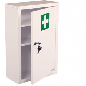 Wall Mounted Metal First Aid Medicine Medical Cabinet Locker The medicine cabinet is ideal for use in the home, at schools or in offices. The cabinet features 2 shelves for organisation of various items such as pills, bandages, plasters. etc. The cabinet is made from heavy duty steel and features a lock for security (includes 2 keys.) The cabinet is designed to be wall mounted and includes mounting holes in the back. Dimensions: 46 x 30.2 x 14cm