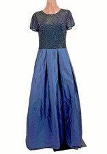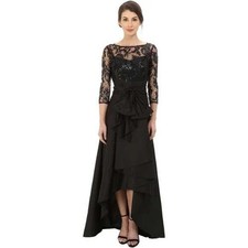 An off-the-shoulder sweetheart neckline and a high-low midi hem give this gown its romantic look. The structured bodice is embroidered in a floral motif that is highlighted with sparkling sequins. A back zipper ensures a fitted silhouette. The A-line taffeta skirt features a matching sash belt that ties at the front to emphasize the drape of the fabric.