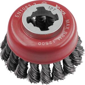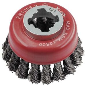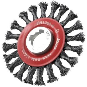 Faithfull X-LOCK Twist Knot Wire Brush for heavy-duty applications. Ideal for removing rust, paint and varnish. Use on stainless steel, aluminium and non-ferrous metal surfaces. Using standard wire brushes on stainless steel can contaminate and cause the material to rust. Featuring the X-LOCK quick change system, ensuring a fast, reliable and effective one click change between tools when used with a compatible angle grinder. Specifications: Wire Type: High Tensile Twisted Stainless Steel (304).Diameter: 75mm.Fitting: X-LOCK.Wire Size: 0.5mm.Max. RPM: 12500.Additional Information:• Diameter (mm): 75• Thread: M14• Wire: 0.50 Stainless Steel