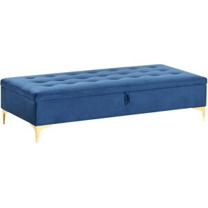 Upholstered Ottoman with Storage in Beige. This modern footstool is the ideal complement to any sofa set, combining style with practicality. Fully upholstered in high-quality velvety fabric with elegant tufting, it blends seamlessly into any interior colour scheme. Its hidden storage compartment, easily accessible with a lifting lid, offers a convenient place to stow away essentials while keeping them close at hand. Supported by sleek metal legs, the piece maintains stability and durability. Pair it with other items from the collection to create a customised seating arrangement that fits your space perfectly. Details: Product Type: Ottoman Style: Modern General Color: Blue, Gold Shade: Navy Blue Material Type: Fabric Main Material: Velvet Additional Material: Eucalyptus Wood Filling Material: Foam Material Composition: 100% Polyester Shape: Rectangular Pattern: Solid Seat Foam Density: 30 kg/m3 Storage: Yes Dimensions: Depth: 78 cm Width: 158 cm Height: 39 cm Seating Surface: 158x78