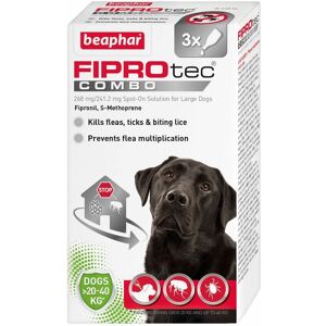 WHAT DOES THIS PRODUCT DO? Beaphar FIPROtec® COMBO Spot On Solution for Large Dogs contains Fipronil and the insect growth regulator S-methoprene which not only kills adult fleas, ticks and biting lice but also interrupts the flea life cycle therefore preventing any exposed eggs and/or larvae from developing in your home for up to 8 weeks. FIPROtec® COMBO for Large Dogs kills fleas for up to 8 weeks and ticks for up to 4 weeks. It is important to establish a regular flea control routine for dogs and the household. Dogs who spend a lot of time outside are especially at risk from fleas and ticks. Beaphar FIPROtec® COMBO for Large Dogs holds the legal category NFA-VPS and can only be sold by a suitably qualified person. WHATS IN THE PRODUCT? 268mg Fipronil, 241.2mg S-methoprene IS THIS PRODUCT SUITABLE FOR MY DOG? Suitable for dogs over 8 weeks of age and weighing more than 20kg HOW TO USE? Before use, read the package leaflet for full instructions and all warnings, including user
