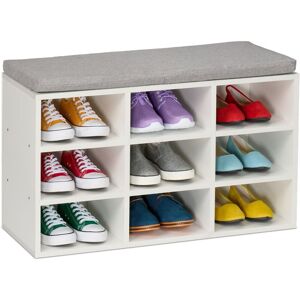 This modern shoe bench with grey seat cushion is ideal for the hallway, porch or bedroom. It offers comfortable seating when putting on shoes and scores points thanks to its many open compartments with clever storage space for shoes, accessories or slippers. The padded seat makes the bench a comfortable place to sit. As hallway furniture, shoe cabinet or coat rack bench, it is space-saving, practical and stylish at the same time. Shoe Bench in Detail - Shoe bench with 9 compartments: H x W x D: approx. 49.5 x 80 x 31 cm / approx. 16 kg - Dimensions of compartments H x W x D: approx. 13 x 25 x 30 cm each - Shoe bench with 12 compartments: H x W x D: approx. 49.5 x 104 x 31 cm / approx. 20 kg - Dimensions of compartments H x W x D: approx. 13 x 25 x 30 cm - Shoe bench with 15 compartments: H x W x D: approx. 50 x 105 x 30.5 cm / approx. 22 kg - Dimensions of compartments H x W x D: approx. 13 x 19 x 31 cm Hallway Bench with Shoe Storage - Height of seat cushion: approx. 3.5 cm - Load