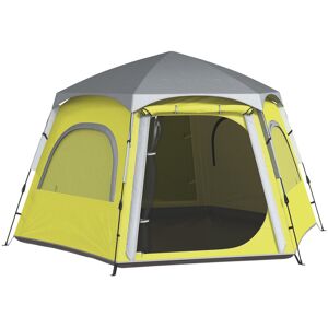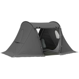 Share the fun of your camping with company. This Outsunny 2-room family tent comes with a bedroom and a middle living room - room for 3-4 people. Fibreglass poles mean a tough core, with the water-resistant shell protects up to 2,000mm of rainwater. Doors to enter each space easily. 18 x ground stakes, 8 x guy ropes and carry bag included.- 4 man tent; A bedroom, a living room and a porch; - Lantern hook to light up at night - keep naked flames away; - Floors keeps you dry; - Mesh windows for ventilation, come with covers; - Features two zipper doors for easy access; - Waterproof up to 2,000mm of rain; - 18 ground stakes, 8 guy ropes and carry bag included; - Materials: Polyester fabric, Fibreglass; - Overall Dimensions: 130H x 370L x 220Wcm; - Folded Dimensions: 20H x 70L x 20Wcm; - Bedroom Dimensions: 210L x 180W x 128Hcm; - Living Room Dimensions: 210L x 180W x 128Hcm; - Door Size: 250W x 120Hcm, 280W x 128Hcm; - Window Size: 35W x 50Hcm; - Weight Capacity: 1kg (top hook); - Windproof Level: 3-5; - Item Label: A20-417V00GN; Outsunny Colour: Green