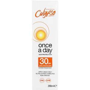 Calypso Sun Once a Day Sun Protection only needs to be applied to the skin once and protects you all day long. The water resistant formula provides protection against both UVA and UVB rays. The range consists of five products ranging from SPF10 to SPF50+. Ingredients:* Alcohol Denat., Ethylhexyl Methoxycinnamate, Octocrylene, C12-15 Alkyl Benzoate, Butyl Methoxydibenzoylmethane, Cyclopentasiloxane, Ethylhexyl Triazone, Bis-Ethylhexyloxyphenol Methoxyphenyl Triazine, Hyroxypropylcellulose, Acrylates/Octylacrylamide Copolymer, Tocopheryl Acetate, Aloe Barbadensis Leaf Extract. *Ingredients listed correspond to the current state of production. Since we regularly adjust our formulations to incorporate new scientific findings, the declaration of ingredients specified on the package applies in each case. Calypso Once A Day Sun Protection SPF30 in Clear