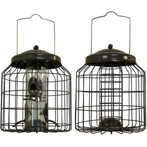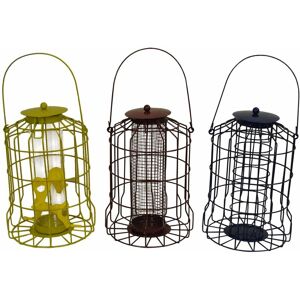 Set of 3 large, attractive metal squirrel proof bird feeders designed to keep unwanted visitors out, but let the garden birds in. Each feeder is surrounded by an anti-squirrel cage to protect the feed from unwanted garden pests. An ideal set to go with a feeding station or as individual feeders around the garden, they are made from powder coated steel. Strong and robust, they hold a good quantity of food to keep birds fed through cold weather and feature an easy flip-top lid for re-filling the feeders. The dimensions of the feeders is 18cm x 26cm plus a 10cm hanging handle. Each feeder is used for a different food for the birds: the yellow feeder is used for sunflower hearts and various seeds, the blue feeder is used for suet fat balls, the red feeder is used for peanuts and nuts. * Set of 3 squirrel proof feeders * Large hanging hook * Colour coded