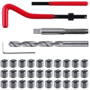 1pcs 8.3mm twist drill , 1pcs M8x1.25 screw tap, 1pcs installation tool, 1pcs breaking pin tool, 1pcs mini hexagonal wrench, 25pcs M8 thread insert. Attention: Before you buy this kit, please make sure which size do you need. M8 thread inserts is made of stainless steel, installation tool and breaking pin tool electrophoresis treatment, sturdy, not easy to corrode. Twist drills and M8 screw taps are made of HSS (high speed steel), which has better wear resistance and heat resistance. There is a limit screw on thread insert installation spanner, which can control the push depth of thread inserts. 135° angle of twist drills, with stronger metal penetration and higher efficiency 1. Drill out the injured thread with the drill bit. 2. Check the thread and pitch of the tap and the bolt match. 3. Use the specific taps for cutting the holding thread into the cleared hole. 4. Place the insert on the installation tool and center the insert tang in the tang slot. Wind the insert in with gentle