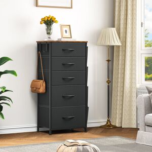 Say hello to practical style with our black chest of drawers, a solid combo of a reliable metal frame and a robust MDF wooden top, completed with five handy, removable and foldable drawers with easy-pull fabric handles for swift access, all sitting on four adjustable plastic feet to keep those floor scratches at bay; the durable, breathable non-woven synthetic fabric used on all sides makes cleaning a breeze - just dab with a damp cloth and let it air dry; and don't sweat the assembly part - our detailed instructions, tutorial video, and included hardware make it so easy, just tapping in a few screws is all it takes; the unit's modern look with fabric drawers, a sturdy white metal frame, and a waterproof wooden tabletop makes it a perfect fit for any living space - from your living room and bedroom to the hallway, entryway, closet, or even nursery; and let's not forget the capacity - those five drawers offer you an array of storage options, creating a neat and organized space in any room, with overall dimensions of 45 x 30 x 95 cm and roomy top and bottom drawers measuring 40 x 28 x 14 cm and 40 x 28 x 21 cm respectively. Rebrilliant