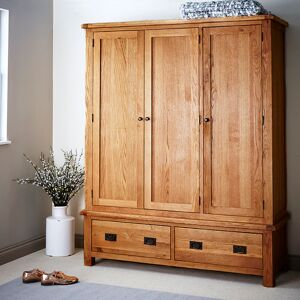Maximize your storage in style with this rustic 2-drawer, 3-door triple wardrobe. Crafted from a combination of solid oak, pine, and oak veneers, it delivers a perfect blend of durability and natural beauty. The hand-waxed finish enhances the character of the wood, showcasing its rich grain and adding warmth to your space. Behind the three doors, you'll find a spacious interior with a solid wood hanging rail for your clothing. The two generously sized drawers below provide extra storage for folded garments, linens, or accessories. Completed with traditional drop handles in an antique finish, this wardrobe is a stunning addition to rustic, farmhouse, or classic interiors. Union Rustic