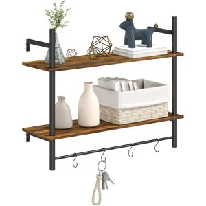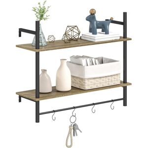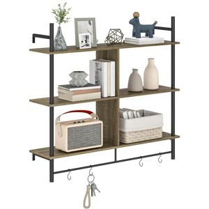 Feature: Three-tiers: plenty of display room for favourite pieces Four 'S' hooks for additional hanging storage Steel frame for a strong, supportive core Two guardrails on the upper shelf, helps prevent items falling off Wall-mounted floating design: no floor space required Maximum load 29kg, assembly required Specification: Colour: Rustic Brown Materials: Particleboard, Steel Overall Dimension: 104L x 24W x 96.5Hcm Compartment Size: 51W x 24D x 30.5Hcm Hook Size: 5.5W x 6.5Hcm Weight Capacity: 29kg (total), 8kg (top), 4kg (shelf), 3kg (shelf rod), 0.5kg (hook) Item Label: 830-947V00RB 1 x Floating Shelves 4 x Hook 1 x Manual
