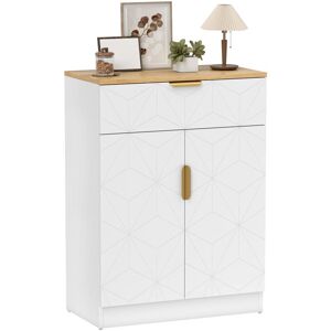 Elevate your space with the HOMCOM kitchen storage cabinet, where modern luxury meets functionality. Adorned with a chic marble texture and glamorous gold-tone legs and handles, this sideboard combines style with practicality. It features spacious cabinets, including a large double-door and a smaller single-door, each housing a 3-level adjustable shelf to cater to your storage needs. Add a touch of sophistication to any room! Specifications: ● Colour: White Marble Tone ● Materials: Particle Board, Metal ● Overall Dimension: 107W x 35D x 75H cm ● Big Cabinet Inner Size: 68W x 31D x 57H cm ● Tier Height: 28 cm ● Small Cabinet Inner Size: 33.5W x 31D x 57H cm ● Tier Height: 26.7 cm/28.7 cm ● Bottom Height to Floor: 15 cm ● Total Weight Capacity: 58 kg ● Shelf Weight Capacity: 14 kg/8 kg (big cabinet), 10 kg/6 kg (small cabinet) ● Tabletop Weight Capacity: 20 kg ● Item Label: 83B-029V00WT Features: ● Modern luxury style with marble texture, gold tone legs and handle, enhances your home's