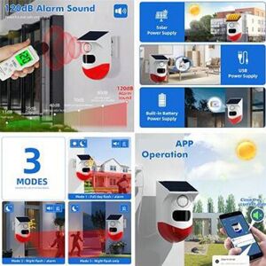 Remote Cell Phone APP Control; 24-Hour Alert Mode, Sound And Light; 24 Hours Silent Mode, With Light And No Sound; Intelligent Judgment Of The Daytime No Alarm, Night Into The Alert State; Nuisance Mode, Silent Alarm At Night; Full Waterproof Patent Structure, Easy To Install, No Need For Debugging And Wiring; Detection Angle Of 110 Degrees; Detection Distance Of 9-12 Meters; Put Pet Interference False Alarm 25kg; Using Digital Design Judgment, Zero False Alarm; Using A Patented Fresnel Lens, Effectively Overcome The Sunlight Interference False Alarm; 24 Hours Sound And Light Mode; 24 Hours Flash Mode; Night Sound And Light Mode; Night Silent Mode; Learning Remote Control; Delete The Remote Control; Shutdown; Description: 1. Power Supply: Solar Charging 2. Quiescent Current ≥50uA 3. Alarm Current ≥100mA 4. Wireless Distance: ≥100m 5. Wireless Frequency: 433.92MHZ 6. Alarm Loudness Loudness ≥ 120dB 7. Alarm Mode: Support Mobile Phone APP 8. Waterproof Standard: IP67 size: 135 x 65 x