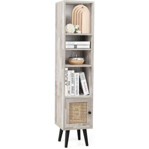 The sturdy and stylish tall storage cabinet is a wise addition to living room, bedroom or dining room. With its slim shape and ample storage space, the unit can serve as a corner bookcase that takes a few floor space while keeps the room clean. And its Boho design, the rattan woven door and the natural finish, boosts a vacation-like vibe to improve the room decorations. At the base there are 4 tapered legs in Mid-century modern style to add a contemporary flair. In addition, the solid wood legs also provides a strong support for the whole cabinet. Features:Ample storage space for books, ornaments, CDs, photos and plants12-position adjustable shelf allows for customized storage spaceNatural rattan door protects privacy while keeps good ventilationEquipped with 2 anti-tip kits for extra security4 robust legs made of solid wood offer a long service lifeDetailed instruction included for easy assemblySlim and tall cabinet is suitable for small space Specification:Material: Engineered Wood,