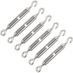 M4 Turnbuckle - 6Pcs Stainless Steel Turnbuckle Wire Rope Tensioner, Size: M4 Wire Rope Tensioner, Type: Hook and Eye Turnbuckle. Turnbuckle Hook - Made of 304 stainless steel, safety and reliability, sturdy and durable, water, rust and corrosion resistant. Wall Mounted Turnbuckle - Easy operation, simple twist to increase or decrease tension, good for indoor or outdoor use. Turnbuckle Turnbuckle - Good for stainless steel wire rope, clothesline, chain and other ropes. Perfect for hanging garden lights, it can also be used for deck rope railings by yourself, good idea for garden fences, trellises, hanging curtains, etc. You Can Do What You Can Do, You Want To Do! Steel Turnbuckle - Tension Wire For Climbing Plants On The Terrace, Gardens; Can Also Tension The Wire That Supports Plants On A Brick Wall.