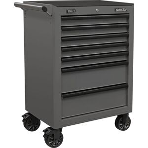 Sealey Superline PRO® Rollcab 7 Drawer - Grey/Black Features: All heavy gauged steel construction and manufactured with steel inner walls for extra strength and durability. Heavy-duty 45mm ball-bearing drawer slides provide superior performance and carry heavier loads. Full height rear locking mechanism, locks full-length drawers in multiple locations. Added security provided by cylinder locks. Supplied with two keys. Rust and solvent resistant powder coat paint finish. Includes four extra-heavy-duty Ø125mm PU/PP alloy wheels, two castors with large toe locks and two fixed wheels. Rollcabs feature a high polished chrome handle to enable smooth manoeuvrability. Also includes a 6mm thick top mat. Drawers ideally sized for fitting Sealey themed tool trays. Each drawer features stainless steel drawer pulls and non-slip liners. Technical Details: • All heavy gauged steel construction and manufactured with steel inner walls for extra strength and durability. • Heavy-duty 45mm ball-bearing