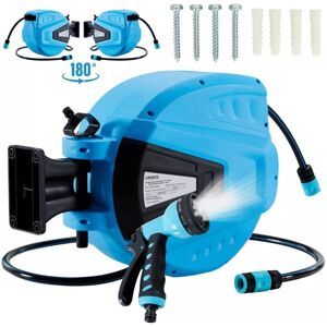 [Easy to mount on a wall] This garden hose reel is equipped with a sturdy wall bracket. It is super easy to install on the wall and can be rotated horizontally by 180°. [Flexible in use] Thanks to the swivel function of the wall hose drum, there will be no kinks in the garden hose when you're watering. After use, the water hose reel can be conveniently folded back against the wall. [9 Spray functions] The spray head has 9 spray functions. It is also equipped with a locking button. Suitable for sprinkling the lawn, watering the garden, watering flowers or cleaning a paved outdoor area. [Many functions] With automatic rewind, hose guide and hose stopper for perfect rewinding. Includes connection hose to the water tap, spray head & hand nozzle with quick-release coupling. [Hose stopper & lock] You can lock the garden hose in place at any length. Thanks to the automatic rewind, the hose reels itself back when no longer needed. Make your garden work easier with the garden hose reel 30 m