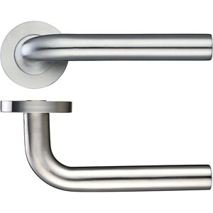 Stainless steel radius push on rose, produced from a grade 201 stainless steel. This sprung lever on rose is great lever rose handle for any wooden interior door. Suitable for 35-54 mm door thickness. Bolt through fixings included. Simple push on rose design - Available in a satin stainless Steel Finish.
