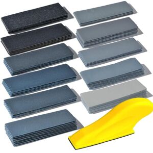 What You Will Get ----- The package includes 75 pieces of wet and dry sandpaper, measuring 9cm/3.54In in width and 3cm/1.18In in length. The grits are assorted: 120*5, 240*5, 600*5, 800*5, 1000*5, 1200*10, 1500*5, 2000*10, 2500*5, 3000*10, and 5000*10, + 1 small hand sanding block. Perfect for Wet or Dry Use ----- The sandpaper is designed for both wet and dry applications, with water-resistant and tensile technology. In addition, the sandpaper features good flexibility, wear resistance, and high grinding efficiency, ensuring prolonged efficiency. Efficient and Practical Polishing Tool ----- The hand-held polishing block, made from dense foam, provides a firm yet comfortable grip for precise control during polishing tasks. Its lightweight design reduces strain on the user's fingers, improving usability. Easy to Use ----- The Velcro hook and loop system facilitates easy and secure attachment and removal, ensuring stability during use. Each sheet is clearly marked with its grit size on