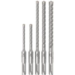 Bosch PRO SDS plus-5X Hammer Drill Bit 5 Piece Set. Bosch PRO SDS plus-5X Hammer Drill Bits are made from an embedded cross of high-quality tungsten carbide, the 4-cutter head offers convenience to professionals who need to drill accurate holes in reinforced concrete. Its 4 flutes channel dust away from the impact point, ensuring effective and long-lasting performance. Reinforced concrete is a common material in infrastructure, commercial and domestic construction, and workers such as electricians, plumbers or HVAC installers often need to drill into it. PRO SDS plus-5X Hammer Drill Bits are designed for this tough task. Contains the following sizes: 5mm, 6mm(x2), 8mm, 10mm.