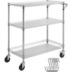 Mobile Storage Cart 3 Layers & 661 LBS Capacity & 6 Hooks Are you ready to take control of your space? Your new 3-tier trolley holds up to 661 pounds of heavy objects and is perfect for hanging various kitchen items thanks to the 6 additional hooks! Large household appliances can also be easily stored thanks to the freely-adjustable shelves. Wheels with silent brake are added to the bottom, allowing you to get to where you need to be without making a sound. Transport various items without worrying about them rolling away, thanks to the lockable wheels! It is perfect for kitchens, restaurants, hotels, and outdoor use. What are you waiting for? It's time to roll! Load Up and Roll Height-Adjustable Shelves Lock into Comfort Assemble in No Time Slide into Amazing Details Mobile Storage Cart This NSF listed 3-tier trolley can hold up to 661 pounds of heavy objects, and can hang various small items with 6 additional hooks. Large household appliances can also be easily stored thanks to the