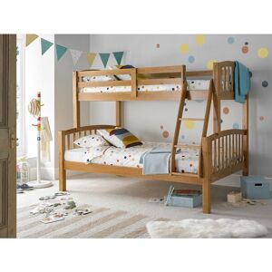 Gap between bunks 77cm Under bed gap 28.5cm Pine finish Solidly built with Modern and Simple design for adults and children Manufactured using Quality Pine wood Perfect space saving solution 3ft Single Top-Tier and 4ft Small Double Bottom-Tier Adjustable left or right side ladder with secure fixture Solid wooden slatted base Manufactured for easy self assembly Complies with the requirements of UK bunk beds (Entrapment Hazards) (Safety Regulations 1987) and the European Standards (EN747-1) Floor to top of side rail 40cm 12.5g coil sprung Turn & rotate Polyester fillings Hand tufted Tested to BS7177 Low profile 15cm mattress height The Mya Triple Sleeper Small Double Bed Frame is a modern bunk bed manufactured using quality Pine and has a finish which helps retain the fine qualities of the pinewood. There are 4 guard rails to the top bunk, 2 to either side which ensures safety for the top bunk sleeper. The headboard and footboard are both styled with vertical slats. This bed can easily