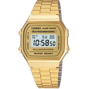 Bring an element of nostalgia to your looks with this retro Casio watch. This digital display watch is crafted with a gold three-link stainless steel bracelet and features an octagonal dial with a gold and digital green face, an alarm and stopwatch feature and is powered by quartz movement. An everyday staple with great functionality, this retro Casio is timeless. • Stainless Steel • Gold bracelet • Digital dial • Dimensions: 36.8 x 36.3 x 9.6mm