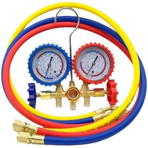 Comes with a hook for hanging. Transparent window for clear observation. Comes with hoses in red, yellow and blue. Quick disconnect couplers for high & low fittings. This manifold gauge set works for applications of the R22 R134A R410 Arefrigerant A/C system. It comes with two straight style quick couplers and three colored hoses. Supports up to 500PSI working pressure and 2500PSI burst pressure color:As shown Material:ABS + metal Size:Hose length: 90 cm Package Contents: 1pcs Freon Cool Gas Meter 3pcs hose Only the above package content, other products are not included. Note: Light reflection and different displays may cause the color of the item in the picture a little different from the real thing. The measurement allowed error is +/- 1-3cm.