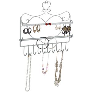 With this jewellery holder, you can keep your jewellery organised and well arranged. The jewellery organiser offers space for earrings, bracelets, watches and necklaces. Since the jewellery bar is mounted on the wall, even long necklaces can be hung up easily and are prevented from getting tangled. Thanks to the romantic heart motif, the earring holder is also a real eye-catcher and a stylish presentation option for your favourite jewellery. Wall Jewellery Holder in Detail - Overall dimensions H x W x D: approx. 30 x 36.5 x 3.5 cm - 27 earring holes D: approx. 0.2 cm - Load capacity: max. 3 kg - Weight: approx. 300 g - Material: iron Decorative Jewellery Rail with Heart - For neat and tidy jewellery storage - For hanging necklaces, earrings, bracelets etc. - Protects long necklaces from tangles - For wall mounting or hanging in the wardrobe - Decorative eye-catcher in a romantic vintage look Included in Delivery - 1x jewellery holder - Decorative items and mounting material are not