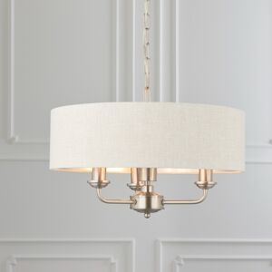 Endon Lighting 94361 Highclere 3 light ceiling pendant light is a sophisticated combination of Natural Linen fabric with a reflective brushed metallic inner and Brigh Nickel metalwork. This statement light is the perfect timeless addition to modern and classic homes. FEATURES * Ceiling pendnat light * Bright Nickel finish * Natural 100 % linen shade * Brushed metallic inner shade * 3 bulbs (sold separately) * Comes with 1 m of chain and cable * Dimmable * Earthed * IP20 * Height adjustable at the point of installation SIZE * Height: 350-1200mm * Shade height: 135mm * Shade diameter: 450mm BULBS * Takes 3 x40 watt (max) Small Edison Screw (E14) Candle Lamps - NOT INCLUDED * IDEAL FOR USE WITH LED LAMPS ORDER CODE - 94361