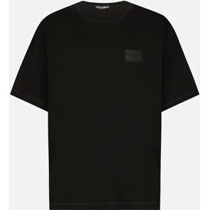 This Dolce & Gabbana black cotton jersey T-shirt features a regular boxy fit for a modern silhouette. Crafted with a stretch knit round neck and short sleeves, it ensures both comfort and style. The iconic logo tag adds a distinctive finishing touch to this versatile wardrobe essential.