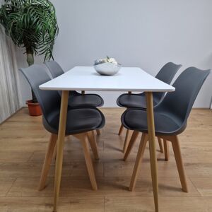 The Dining Table Set is the perfect blend of elegance and functionality, designed to elevate your dining experience. The table features a precision-crafted design with a luxurious finish, combining a laminated tabletop with a subtle satin sheen and solid wooden legs equipped with floor protectors. Its wipe-clean surface ensures easy maintenance, making it ideal for everyday family meals and special dinner gatherings. The table's versatility allows it to seamlessly complement various home settings, from the kitchen to the dining room, or even as a centerpiece in the living or bedroom spaces. Designed to accommodate 4 to 6 dining chairs, this table offers a perfect balance of style and practicality. Paired with ergonomically-designed Scandinavian-inspired dining chairs, the set offers unmatched comfort and sophistication. Each chair boasts a robust polypropylene curved shell for excellent back support, enhanced by a padded faux leather seat for superior comfort. The solid wooden legs, finished with smooth waterfall edges and protective foot pads, ensure stability and safeguard your floors from scratches. Built to last with superior craftsmanship and high-quality materials, these chairs exude style and durability, making them an excellent addition to any living or dining area. Together, the Halo Dining Table and chairs create a cohesive and stylish set that enhances the aesthetics of your home while providing the comfort and functionality you desire. All the essential hardware and tools needed for easy installation & an illustrated installation guide is included, providing step-by-step instructions and ensuring a smooth setup process. Hykkon Chair Colour: White, Table Top Colour: White