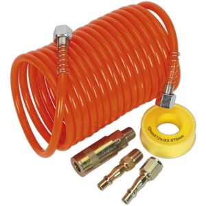 Sealey: Air Hose Kit 5m x 5mm PU Coiled with Connectors Air hose kit comprising PU coiled air hose fitted with 1/4BSP female swivel unions, coupling and adaptor set, and PTFE tape. MPN: AHK03 EAN: 5054511153859 Air Hose Kit 5m x 5mm PU Coiled with Connectors Attributes: MFR Part No.: AHK03