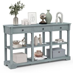 A console table that combines strong sense of vintage design and classicism beautiful shape takes you back to the 20th century early times. To meet diversifying storage demands, our sofa table comes with a wide tabletop, 3 drawers and 2-tier open shelf to keep decorative items and daily supplies in order. In addition, natural wood plus exquisite craftsmanship makes the console stand out from others. Solid wood legs mean better durability, longer life span and higher sturdiness. More, anti-toppling device takes the stability to a higher level. All in all, the multipurpose long sofa table is a reliable addition to your living room or entryway. Costway 3-Tier Console Table Wooden Sofa Side Table W/ Storage Shelves & 3 Drawers in Blue