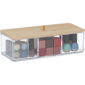 This three-part beauty organiser is ideal for neatly storing your cosmetics and make-up utensils. Whether for hair tie storage, as a cosmetics box or for storing cotton pads or make-up sponges - the make-up storage is extremely versatile. The timelessly simple design of the cosmetic storage with bamboo lid fits in every bathroom and on every dressing table. Make-up organizer in detail - Overall dimensions H x W x D: approx. 7.5 x 23 x 9.5 cm- Interior dimensions per compartment H x W x D: approx. 5.5 x 7 x 8.5 cm- Weight: approx. 0.3 kg- Material: Plastic, bamboo- Colour: Transparent, natural Dressing table organiser with bamboo lid - Keeps things tidy and organised in the bathroom or on the dressing table- With 3 compartments for sorting your make-up and cosmetic items- Ideal for storing ponytails, hair clips, eye shadow and much more- Box made of robust plastic can be easily cleaned under running water- Transparent design provides a quick overview of the contents- Bamboo lid adds